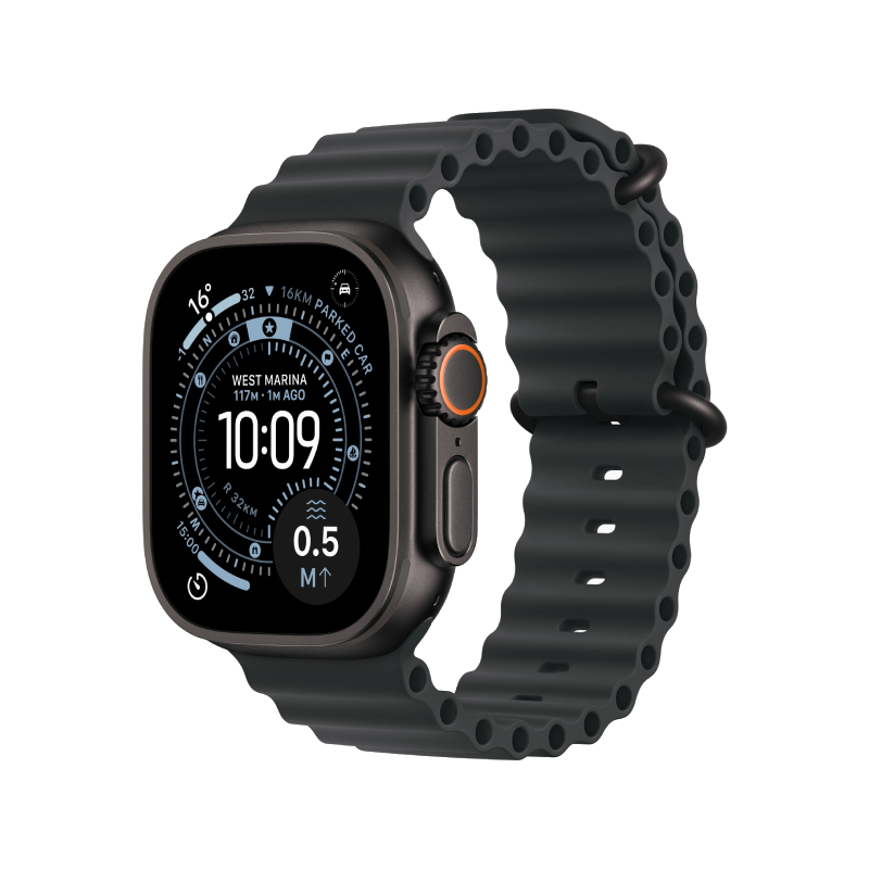 | Hardware and Buttons | Microphone Speaker Customizable Action button Siren/Speaker Antennas (GPS, cellular) Microphone Side button Microphone Digital Crown Depth gauge/Water temperature sensor/Altimeter |