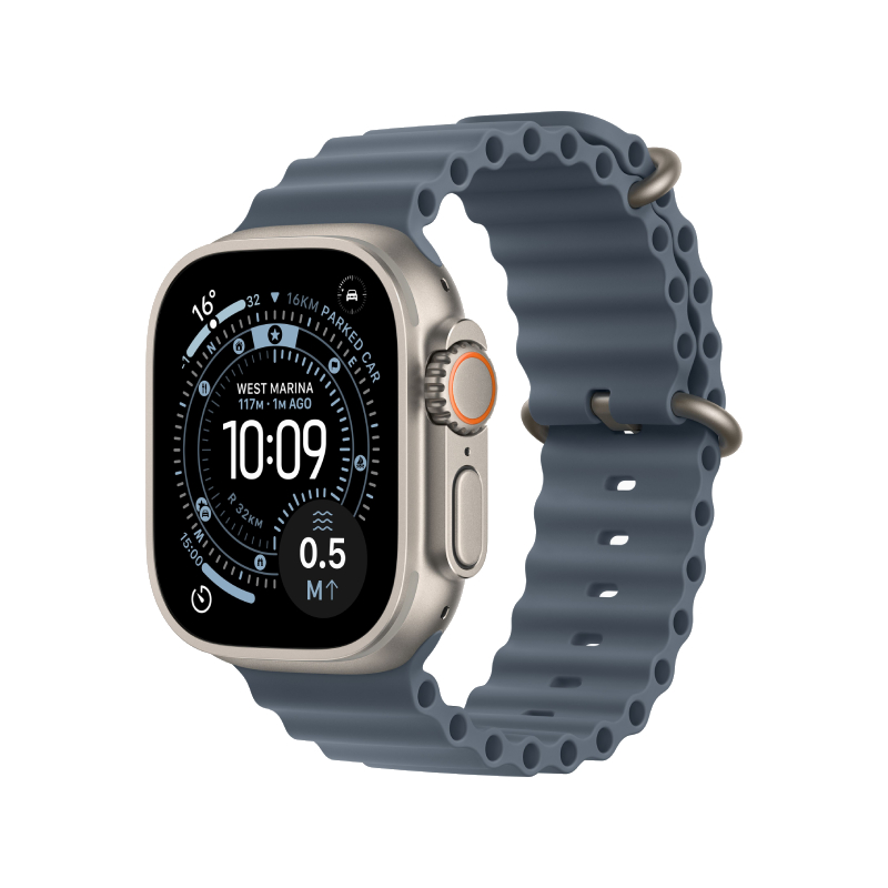 | Controls | Customizable Action button Digital Crown with haptic feedback Side button Double tap and wrist flick gestures Siri with on‑device processing |