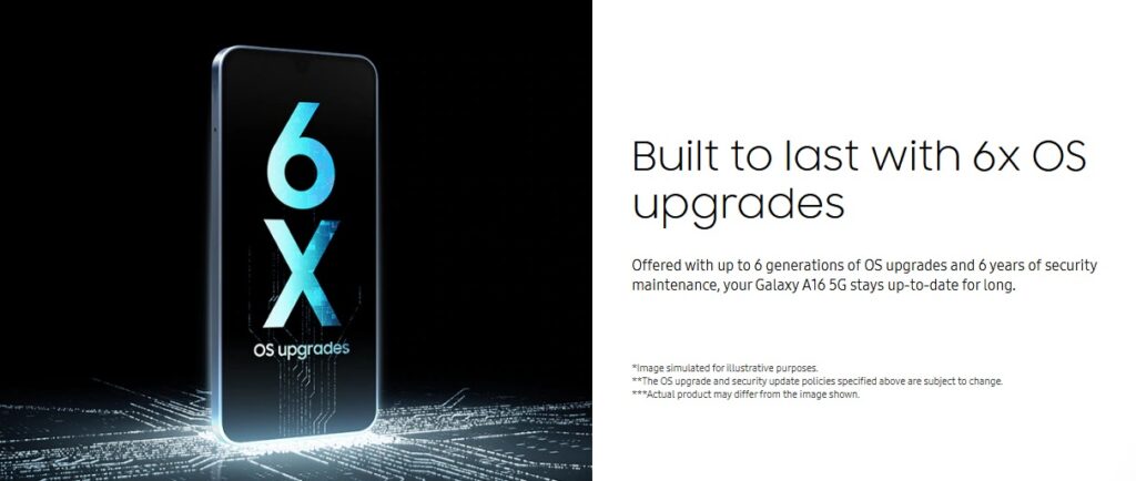 The Galaxy A16 5G will receive 6 generations of One UI and Android OS updates. It is also eligible for 6 years of Samsung Security Maintenance Releases (SMR), keeping the device secure and up to date.